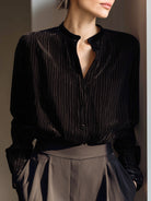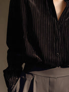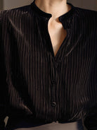 Black Striped Velvet Button-Up Blouse
