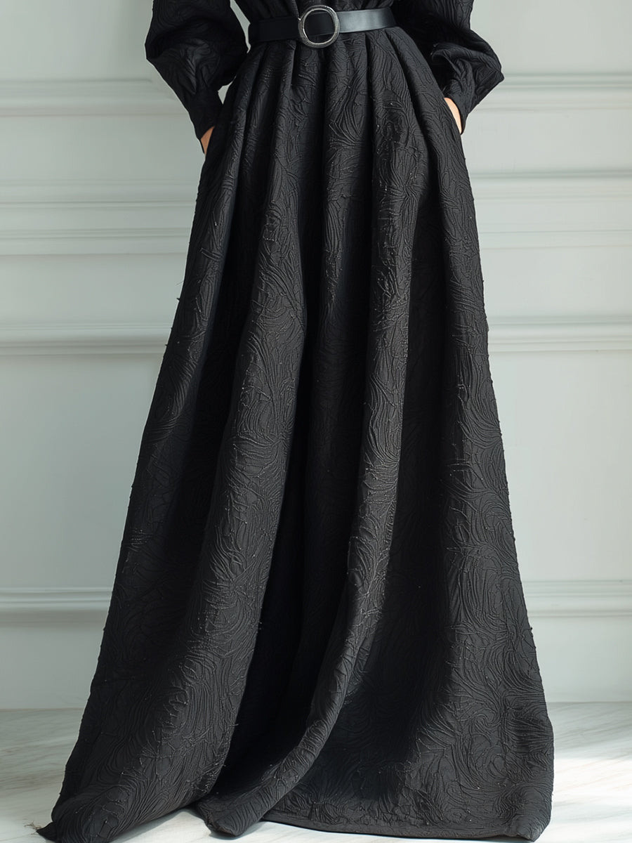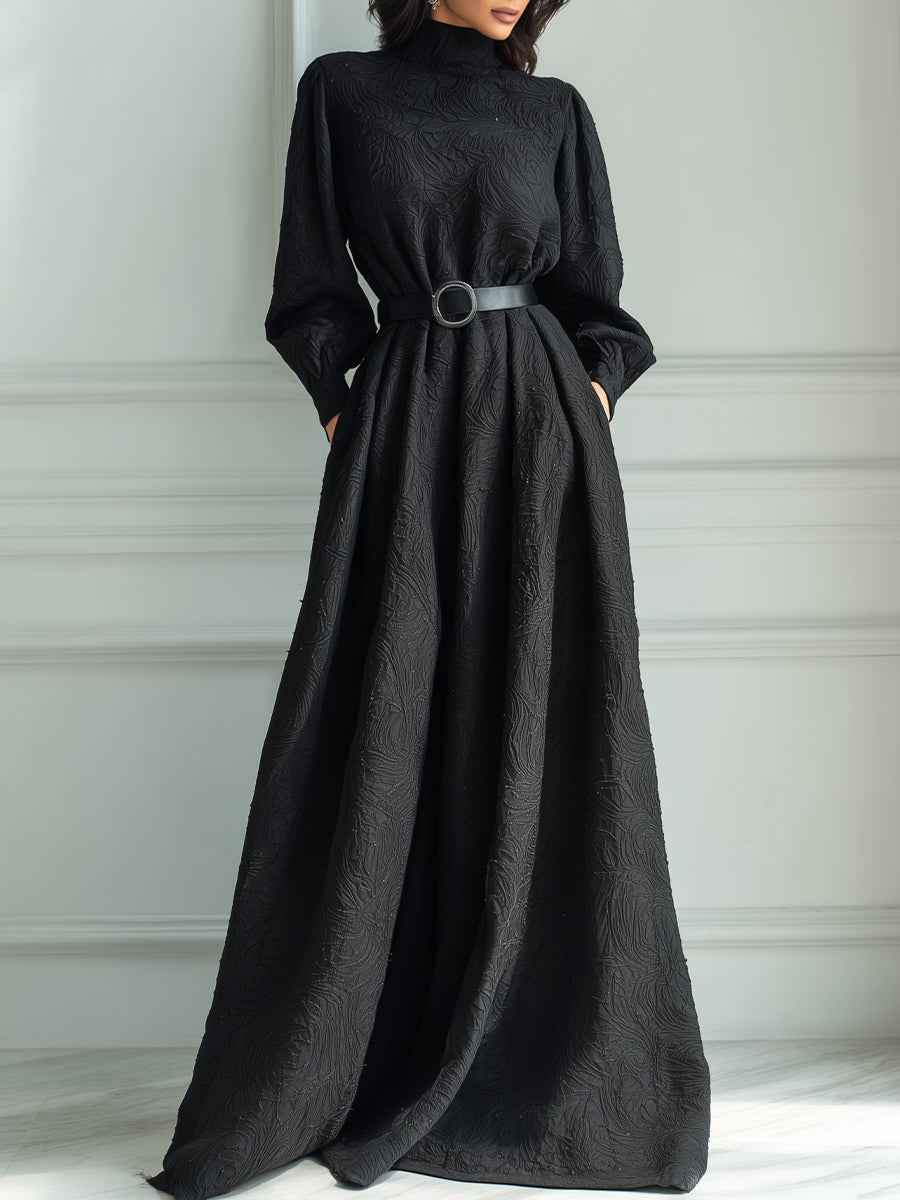 The Black Textured High-Neck Belted Gown by Crovaya brings a refined sense of minimalism and sophistication to eveningwear. Crafted from intricately textured fabric with a subtle raised floral pattern, this gown embodies understated elegance. The high neckline and long bishop sleeves provide coverage while maintaining an air of mystery, balanced by a cinched waist defined with a sleek black belt.