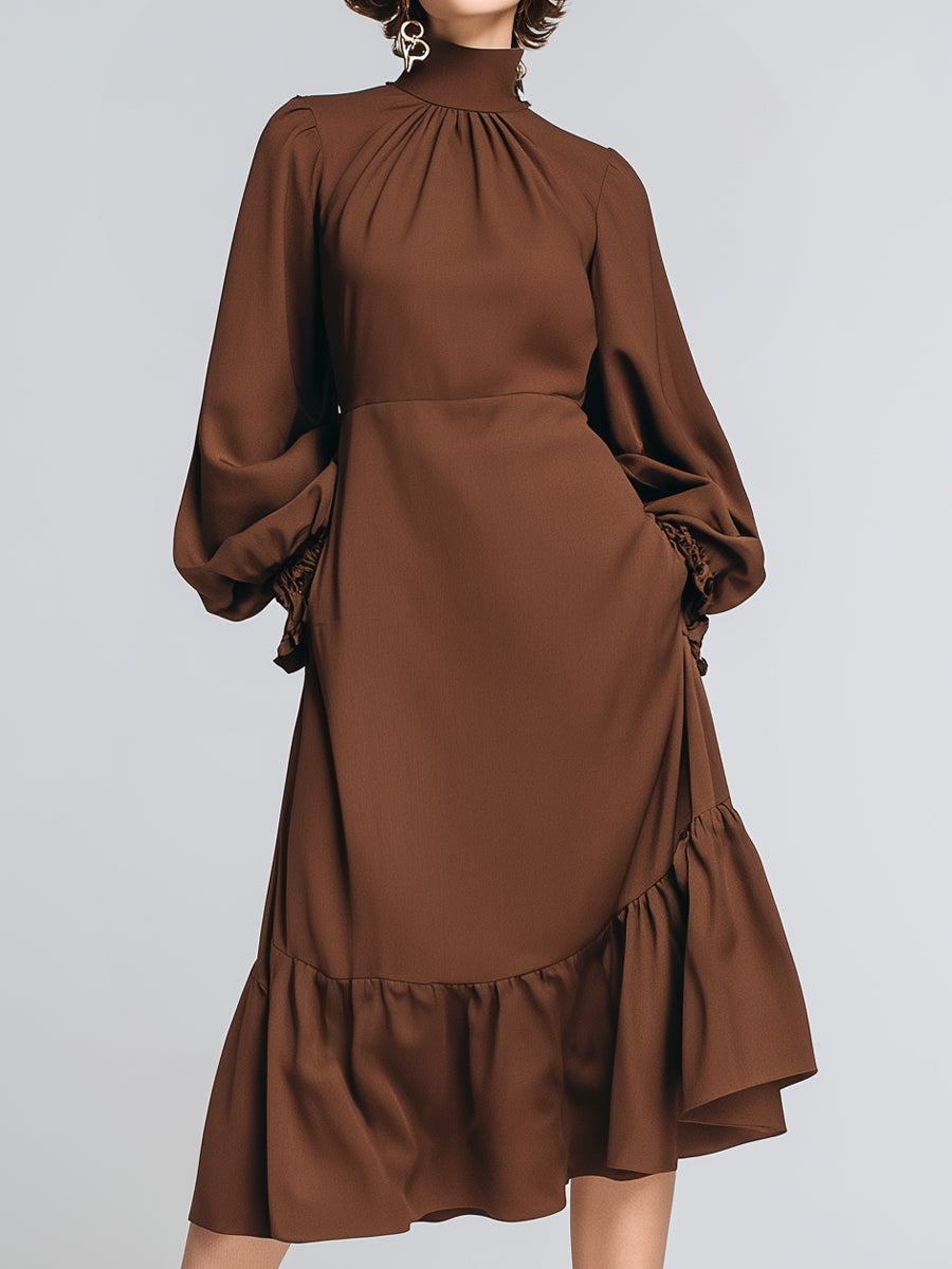 Brown High-Neck Lantern-Sleeve Ruffle-Hem Midi Dress