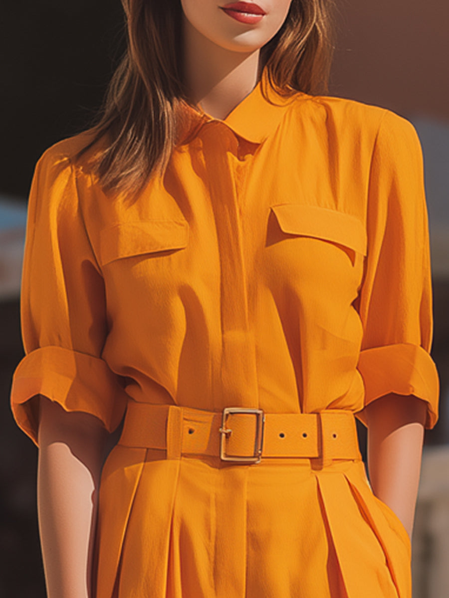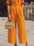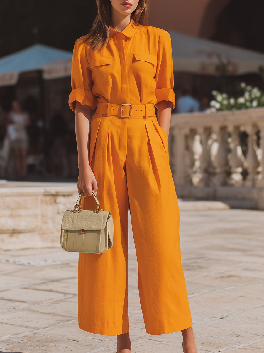 The coordinating waist belt highlights and shapes the figure, providing a cinched, flattering line that smoothly transitions into softly pleated wide-leg trousers. This balance of structure and fluidity ensures graceful movement, making the jumpsuit ideal for warm climates, travel-ready styling, and chic daytime engagements. Thoughtfully placed front pockets enhance functionality without disrupting the sleek aesthetic, while the monochrome appearance elongates the body and exudes understated luxury.