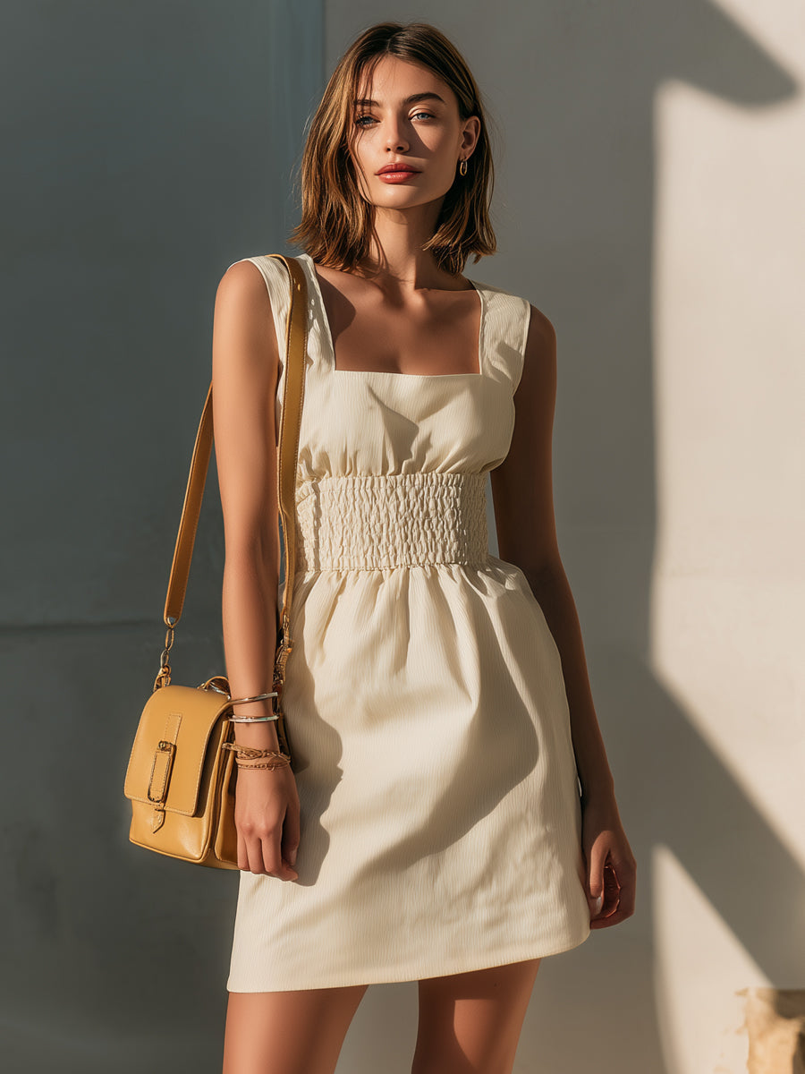 Crovaya presents a refined sleeveless mini dress defined by sculpted simplicity and modern feminine tailoring. Designed with a structured square neckline that beautifully frames the collarbone, this piece maintains an elegant balance of minimalism and poised sophistication. The standout element lies at the waist—a finely smocked detail that gathers the fabric with gentle definition, enhancing the silhouette while offering flexible comfort and a flattering cinched shape.