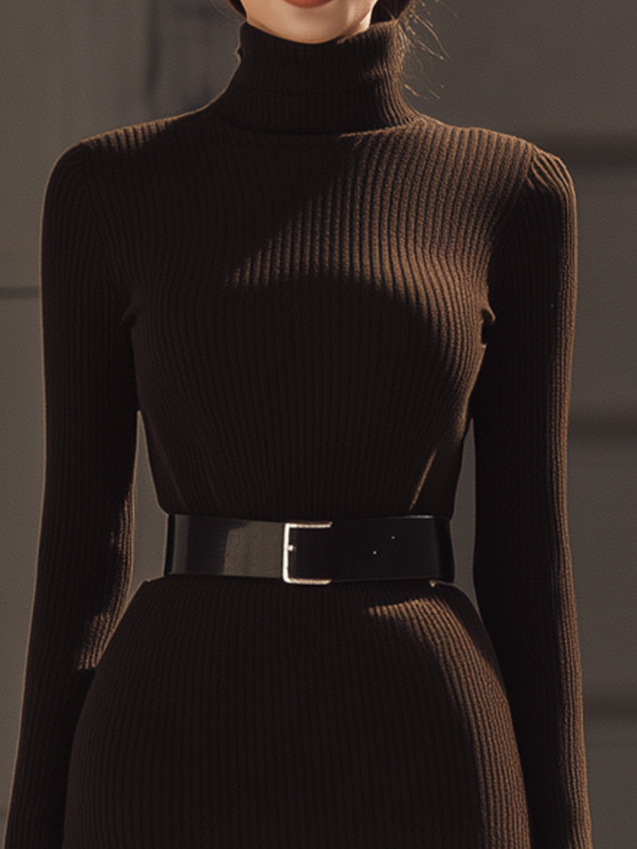 Crovaya presents the Espresso Ribbed Turtleneck Belted Knit Midi Dress — a refined wardrobe staple that captures the essence of modern power dressing. Designed in an elegant deep espresso tone, this dress brings sculptural precision and understated sophistication to cooler seasons. Its sleek, ribbed texture visually elongates the silhouette, contouring the body while maintaining effortless comfort.