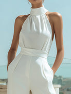 The top features a sculptural high neckline with soft pleating that adds movement and dimension, drawing the eye upward while framing the shoulders with subtle drama. Its sleeveless cut enhances the clean, elongated lines, making it a versatile piece that can be styled alone or layered under structured outerwear. The tailored waistband ensures a smooth, polished finish when paired with the coordinating trousers.