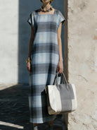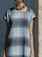 The muted tonal palette of soft grey and powder blue plaid elevates this dress beyond casual styling, offering a quietly luxurious visual texture that feels both artistic and composed. The cap sleeves add a subtle touch of relaxed femininity, while preserving the modern minimalism of the garment. Its ankle-grazing length reinforces the sleek silhouette, allowing it to transition fluidly between daytime engagements, gallery strolls, and elegant evening moments.