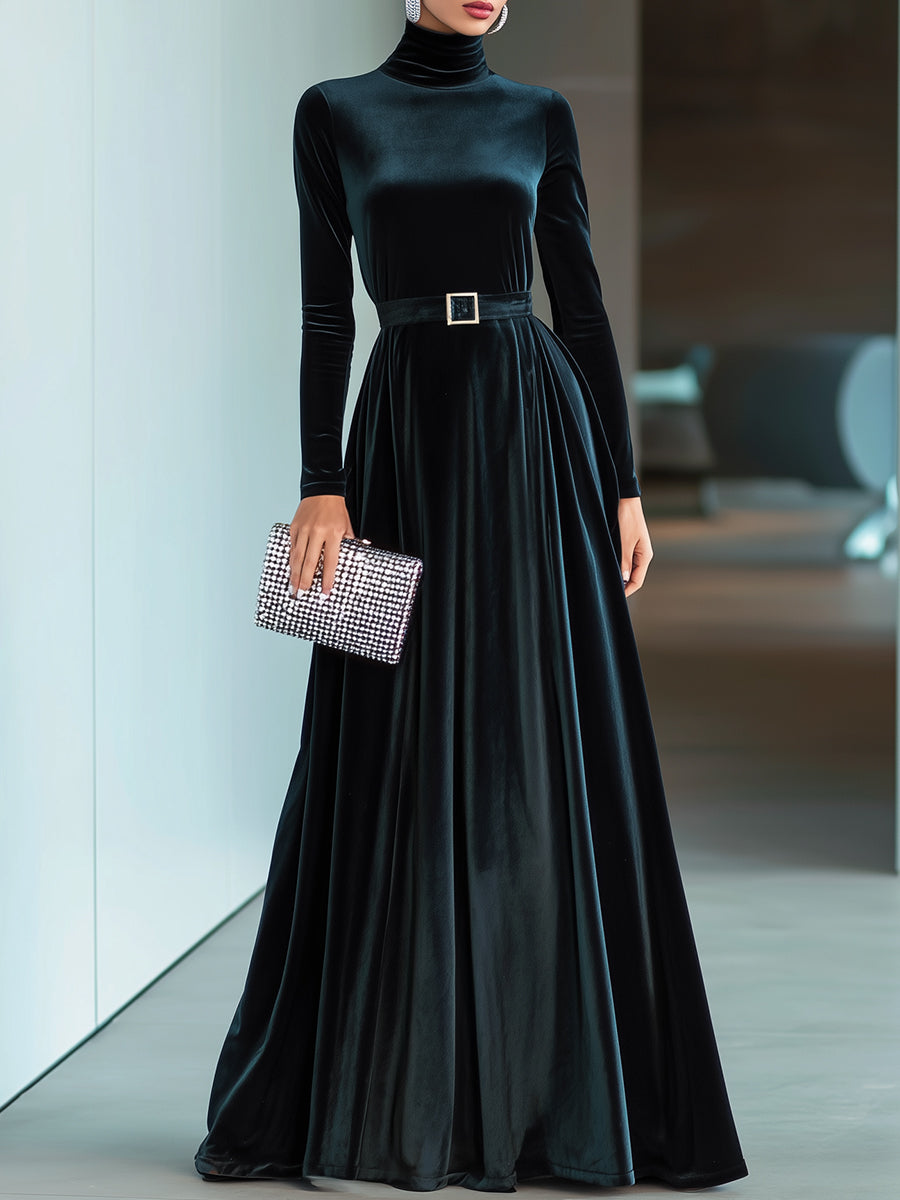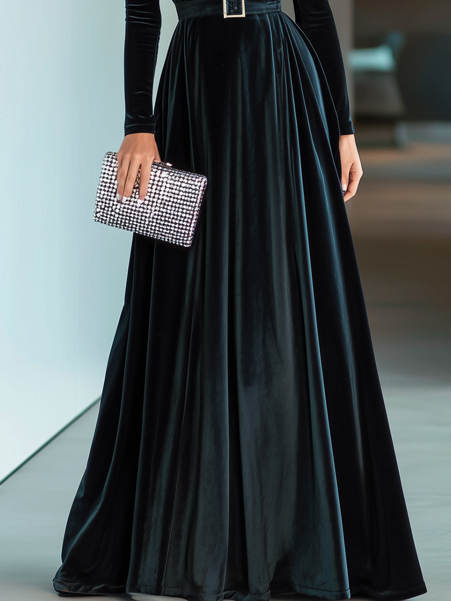 Crovaya presents the Regal Grace High-Neck Velvet Gown, a commanding statement piece that merges classic refinement with modern minimalism. Crafted from sumptuous deep black velvet, this gown exudes luxury with its high neckline and sculpted long sleeves. The waistline is defined by a sleek belt with a polished buckle, adding structure and visual balance to the fluid, floor-sweeping skirt.