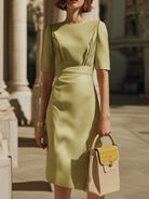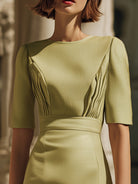 Crovaya presents the Sculpted Pleat-Detail Mid-Sleeve Sheath Dress — a modern expression of elegance designed for women who appreciate refined structure, subtle artistry, and timeless sophistication. This impeccably tailored piece blends architectural precision with feminine softness, creating a silhouette that feels effortlessly polished for every occasion.