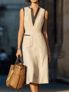 - Design: Sleeveless midi dress with contrasting-edge V-neckline and matching trim pocket detail