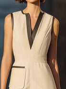Crovaya presents a refined midi dress that embodies contemporary elegance through clean lines, subtle detailing, and a flawlessly tailored finish. Crafted with architectural precision, this sleeveless dress features a sculpted V-neckline outlined with a contrasting trim that adds depth and structured dimension. The contrasting accent continues along the arm openings and pocket flap, creating visual harmony while emphasizing the garment’s thoughtfully engineered design.