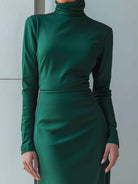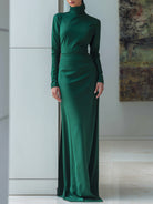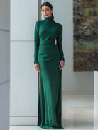 The Emerald Green Sleek Turtleneck Gown by Crovaya is a vision of modern refinement. Its smooth satin-finish fabric drapes fluidly across the body, creating a statuesque silhouette that highlights natural curves. The fitted turtleneck and long sleeves exude sophistication, while the minimalist construction speaks to a contemporary, elevated aesthetic. Designed for formal events, winter soirées, or exclusive receptions, this gown balances modesty and sensuality effortlessly.