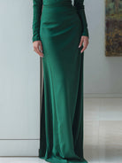 The rich emerald hue adds depth and vibrancy, making it an eye-catching yet tasteful choice. The clean lines and floor-grazing length emphasize an elongating effect, while the unembellished surface offers endless styling opportunities with statement jewelry or metallic accessories. It is a gown for the confident woman who appreciates minimal luxury with maximum impact.
