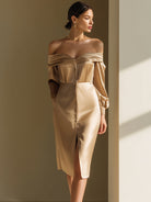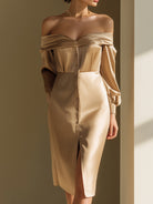 The off-shoulder neckline is carefully structured to create a clean, sculpted frame around the shoulders and collarbone. Draped fabric across the neckline adds a romantic softness, while the long sleeves introduce a refined contrast of volume and shape. The button-front closure brings a tailored, polished appeal, extending down to the midi hem where a subtle front slit adds ease, femininity, and a hint of sensuality.