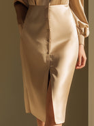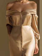 Golden Off-Shoulder Satin Button-Front Midi Dress