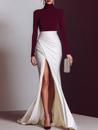 This exquisite two-piece set delivers an unforgettable balance of sleek sophistication and couture-inspired glamour. The high-neck, long-sleeve bodysuit creates a refined and streamlined silhouette, offering elegant contrast against the dramatic draped skirt. Its smooth form highlights the waist while providing a minimalist foundation for the statement lower half.