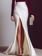 The floor-length skirt features a graceful wrap effect embellished with delicate crystal-like detailing that catches the light with every movement. A striking front slit adds alluring dimension, elongating the legs while maintaining polished restraint. The sweeping hemline flows effortlessly for a look that is both regal and modern.