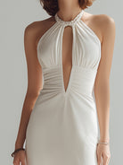 Crafted from a smooth, premium satin-like fabric, the gown skims the body with a liquid softness, enhancing natural curves while maintaining a polished, elevated finish. The halter neckline is adorned with a refined, pearl-inspired embellishment that frames the shoulders and collarbone with radiant delicacy. A dramatic elongated keyhole cutout defines the bodice, offering a bold yet tasteful focal point that elongates the torso and adds striking dimension.