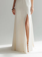 Soft ruching at the waist shapes and contours the figure, ensuring a flattering fit while allowing the fabric to drape naturally with every movement. The full-length skirt flows gracefully to the floor, balanced by a daring front slit that introduces an element of fluid motion and modern sensuality. This thoughtful contrast between structure and softness embodies Crovaya’s signature aesthetic — timeless femininity elevated through meticulous detailing.