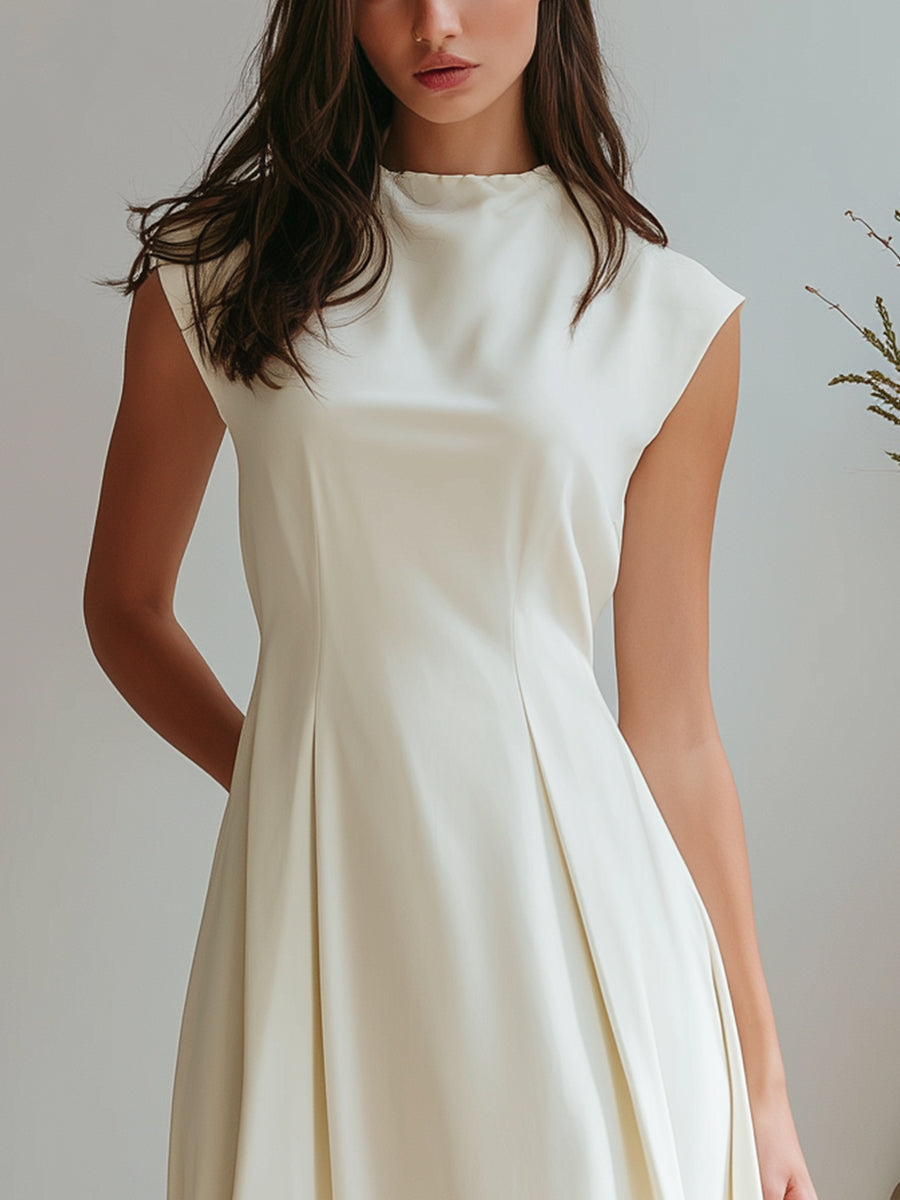 Designed with a high neckline, the dress frames the collarbone gracefully, offering a refined and timeless profile. The sleeveless cut enhances the shoulders while maintaining a streamlined look that feels effortlessly chic. Thoughtful pleating from the waist creates a gentle A-line movement, providing volume without overwhelming the form. The result is a silhouette that flatters through subtle shaping rather than overt detail.