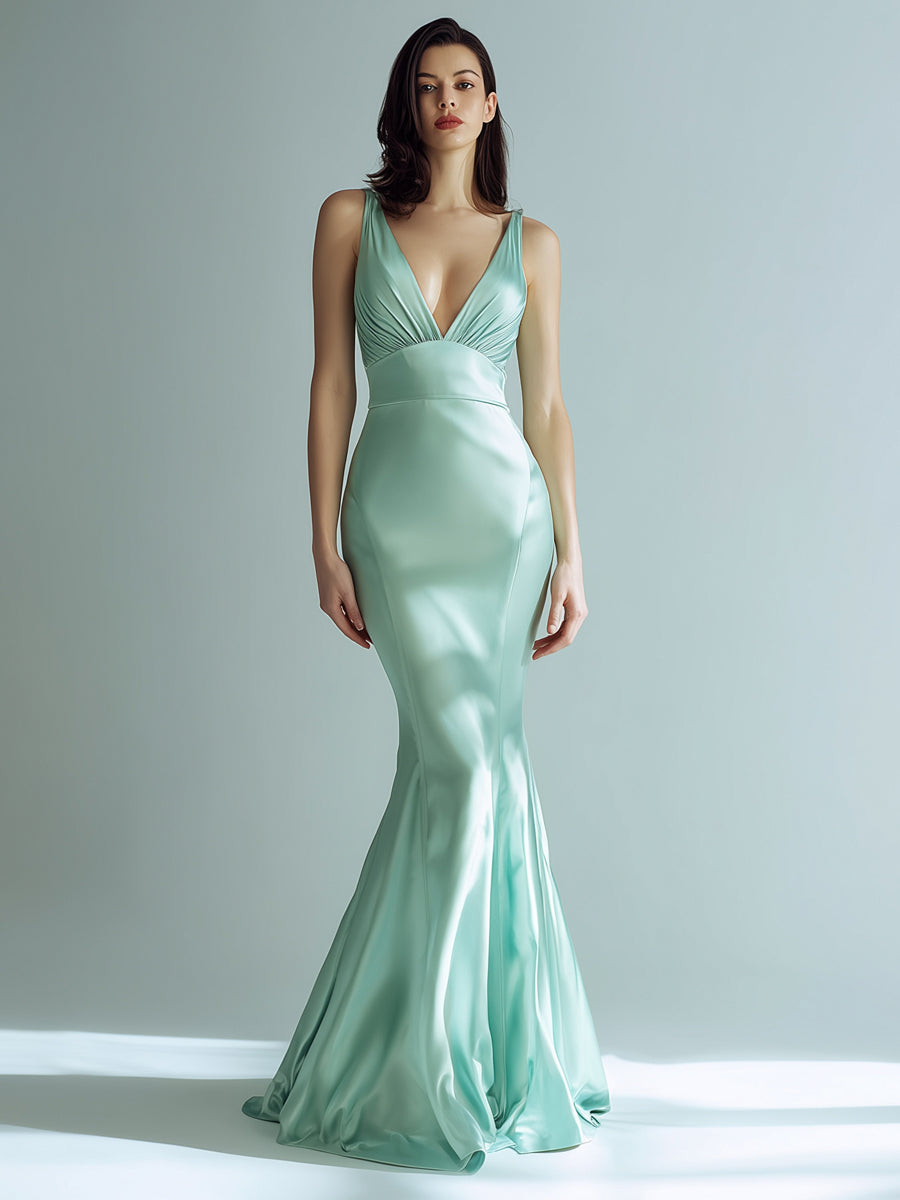 Crafted from premium stretch satin, the gown offers a glossy, liquid-like sheen that moves effortlessly with the body. The fabric’s subtle elasticity ensures a smooth, sculpted fit through the torso and hips while allowing comfortable movement. The plunging V-neckline is beautifully draped and gathered, creating a soft yet defined bodice that flatters the natural contours of the upper body. A structured waistband cinches the silhouette, enhancing hourglass proportions and contributing to the gown’s refined, red-carpet feel.