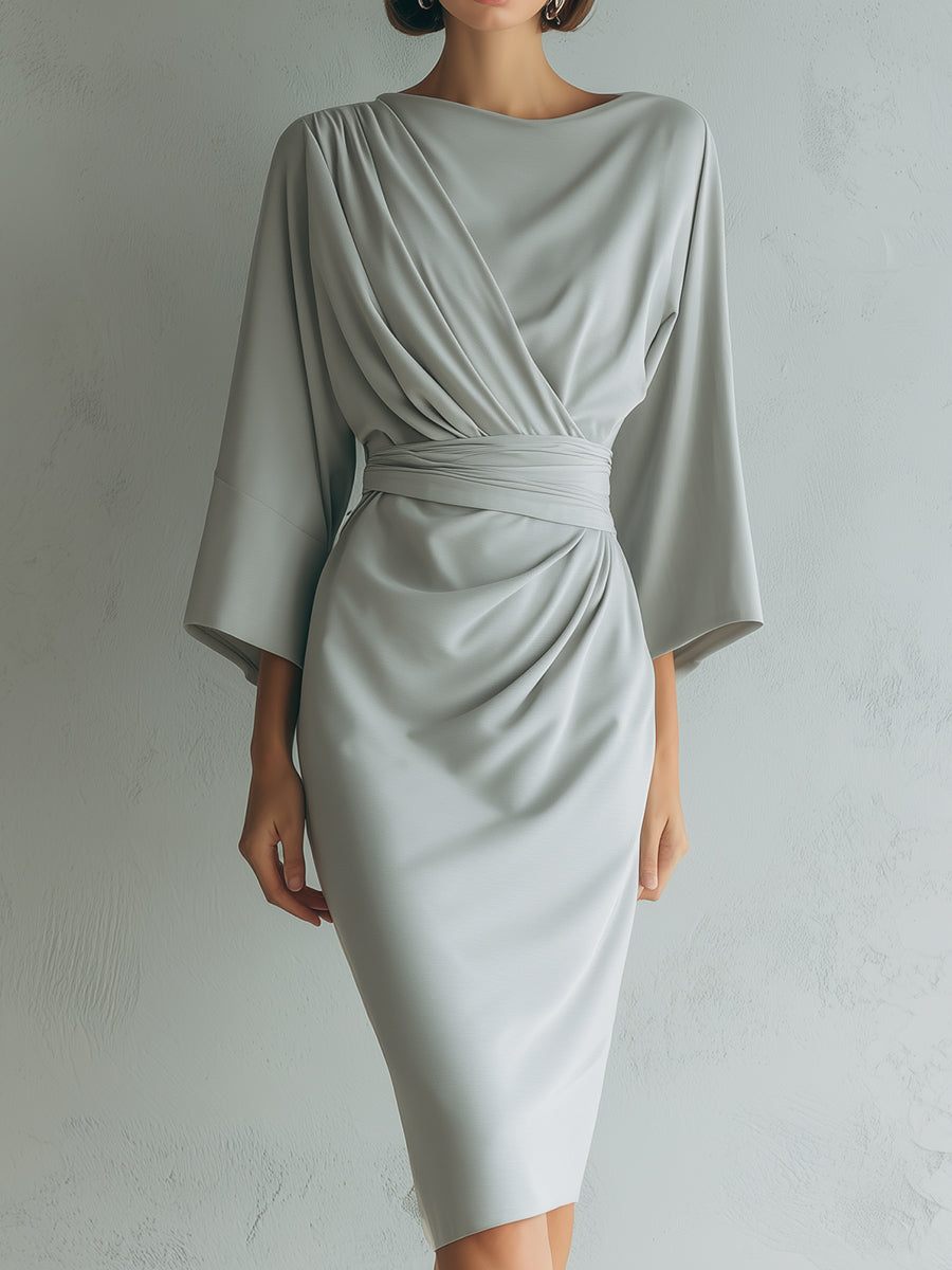 Softly sculpted draping meets relaxed elegance in this mist grey midi dress. Featuring wide kimono-inspired sleeves, an artistically gathered bodice, and a cinched waist, it beautifully defines the figure while remaining fluid and comfortable. The medium-weight fabric drapes luxuriously, creating a polished silhouette without clinging, making this a flattering choice for every body shape.