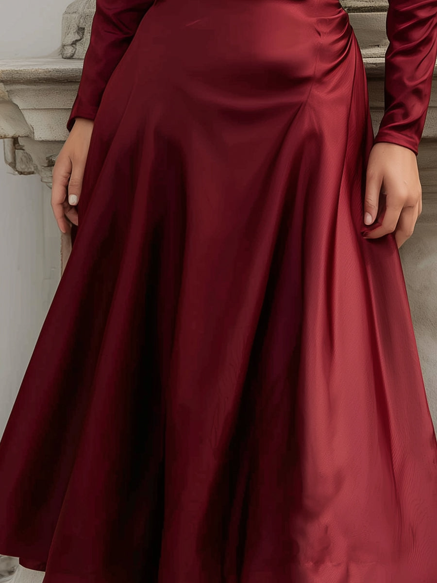 The long fitted sleeves balance the silhouette with poised refinement, making this design suitable for both evening gatherings and formal celebrations. Flowing into a fluid A-line skirt, the hem moves gracefully with each step, offering understated drama without overwhelming the wearer.