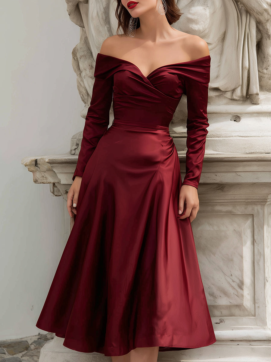 Timeless elegance meets refined glamour in this off-shoulder midi dress, crafted to celebrate feminine beauty with luxurious sophistication. The sculpted neckline draws graceful attention to the décolletage, while the softly draped bodice creates gentle ruching that flatters and defines the waistline with impeccable precision.