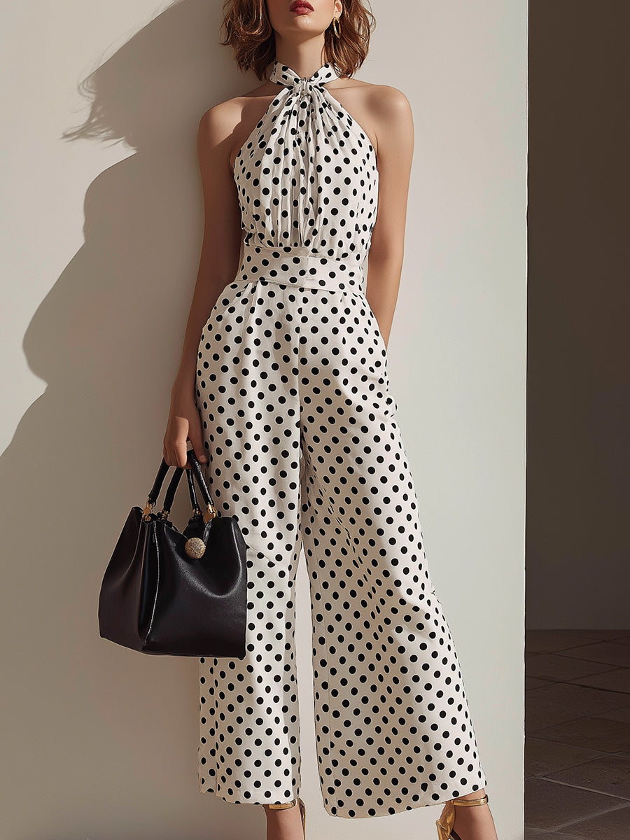 Polka Dot Halter Wide-Leg Jumpsuit With Pleated Bodice