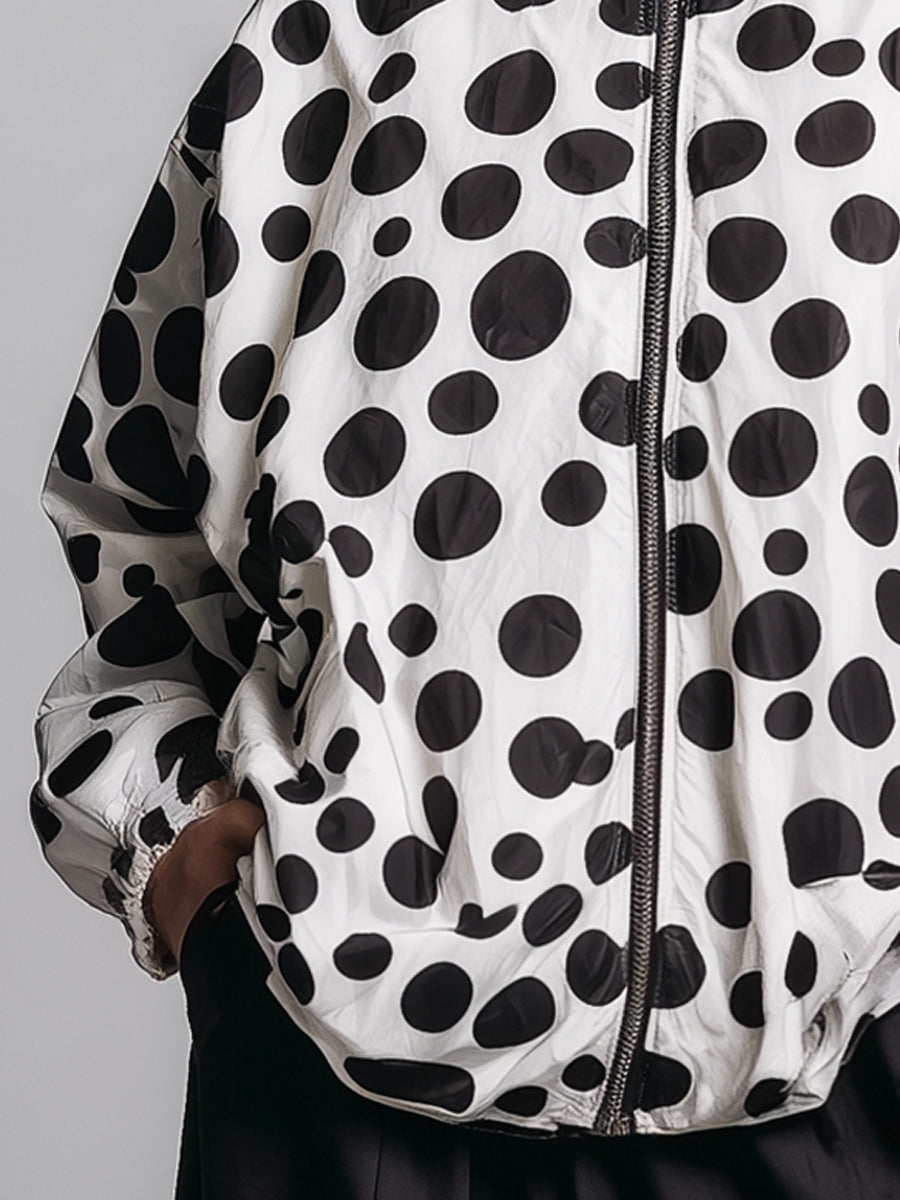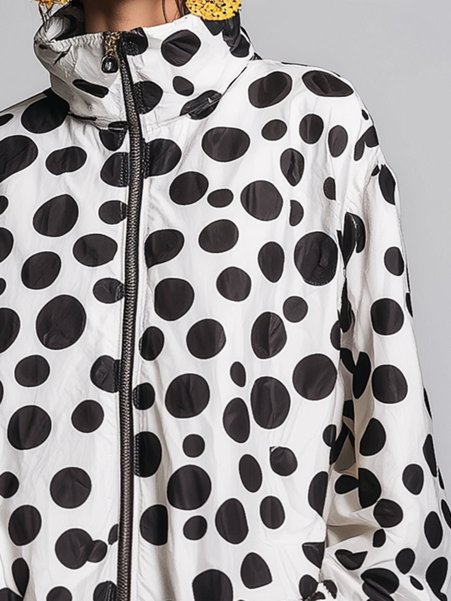 The jacket features a full-length zipper closure, a high collar, and a relaxed, oversized silhouette, creating a comfortable and flattering fit. Its all-over polka dot print adds a fun, retro-inspired element, bringing an element of boldness to your wardrobe. Whether worn casually with jeans or paired with more tailored pieces, this jacket seamlessly integrates into a variety of styling options.