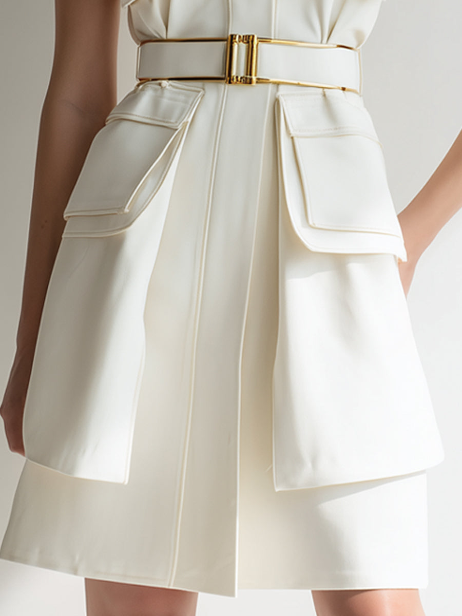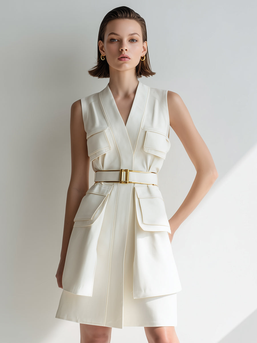 - Design: Sleeveless mini dress with utility-inspired pockets and gold-tone buckle belt
