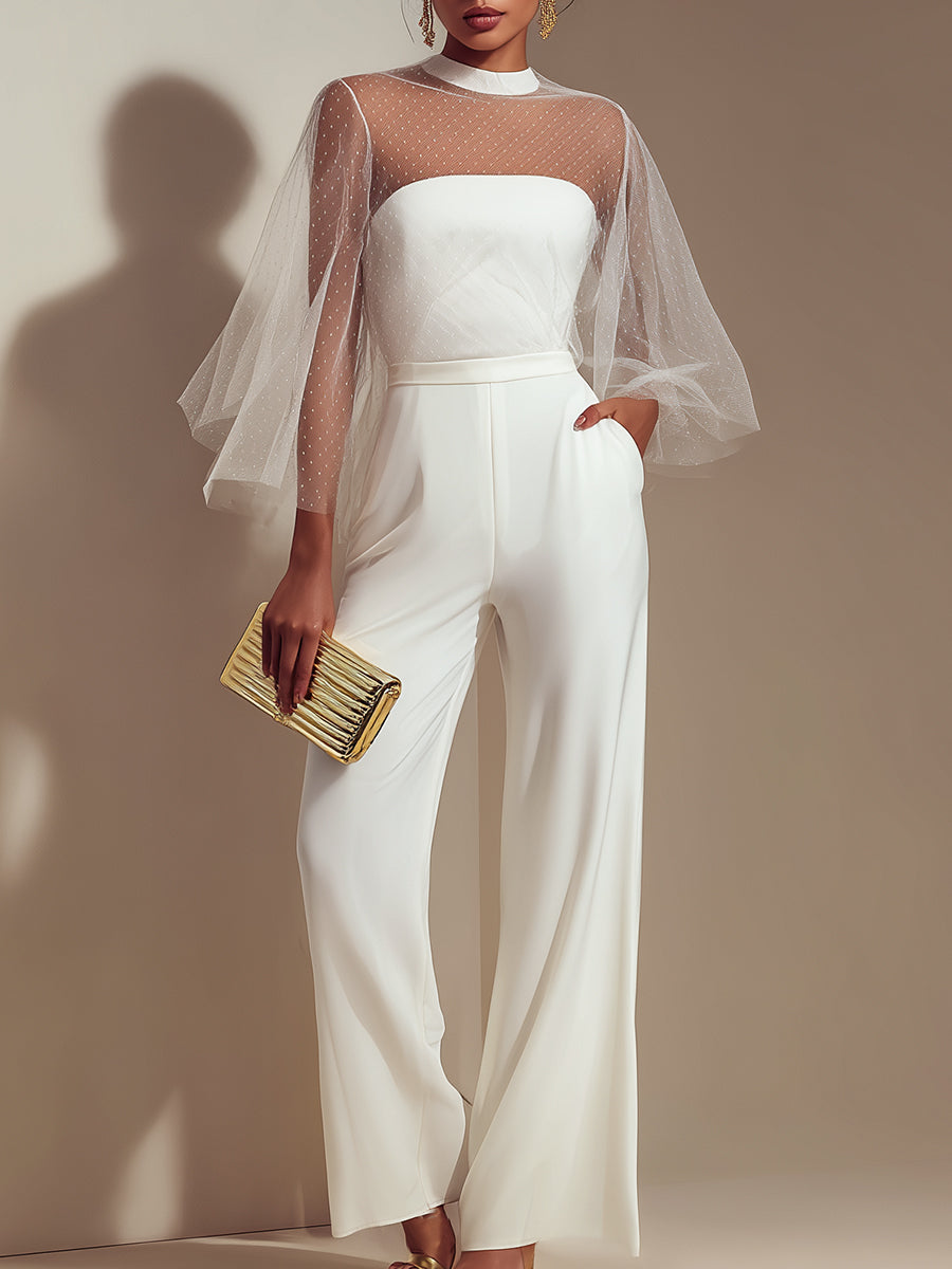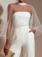 Elegant, modern, and ethereal, the White Sheer Cape Sleeve Jumpsuit with Strapless Bodice is a breathtaking expression of contemporary eveningwear. Designed for women who seek sophistication with a soft, romantic edge, this jumpsuit offers a refined balance of structure and delicate transparency.