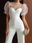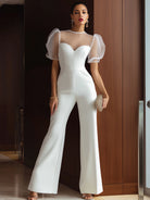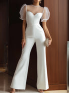 White Sweetheart Jumpsuit With Puff Sheer Sleeves And Wide-Leg Fit