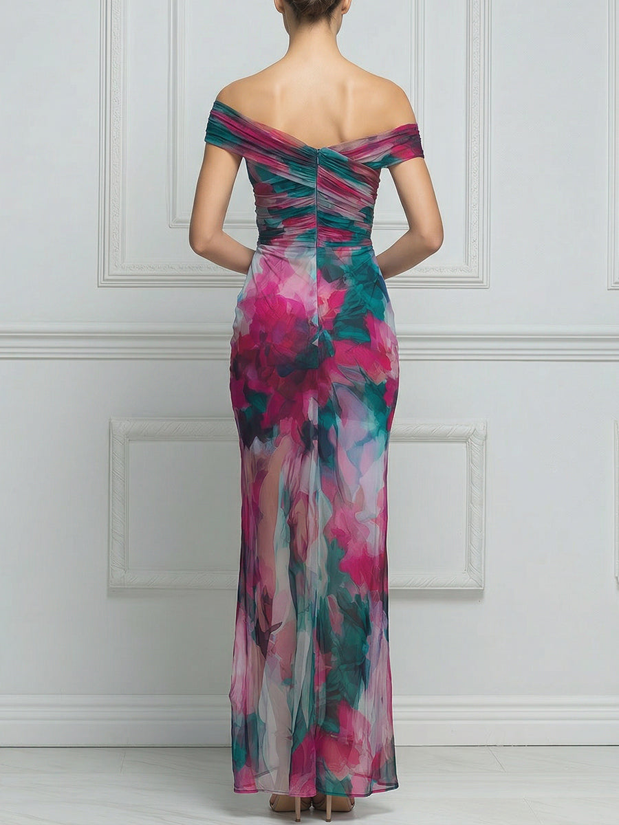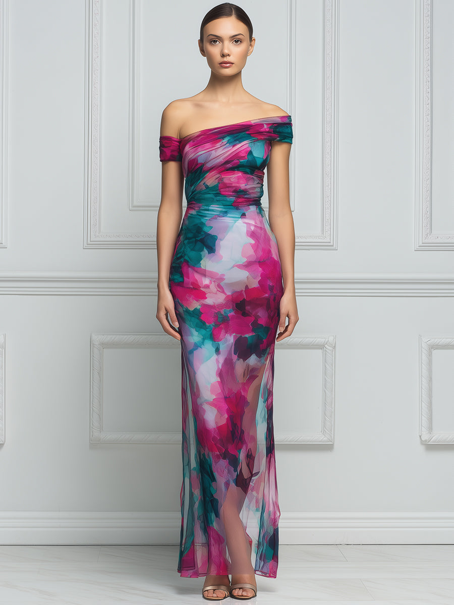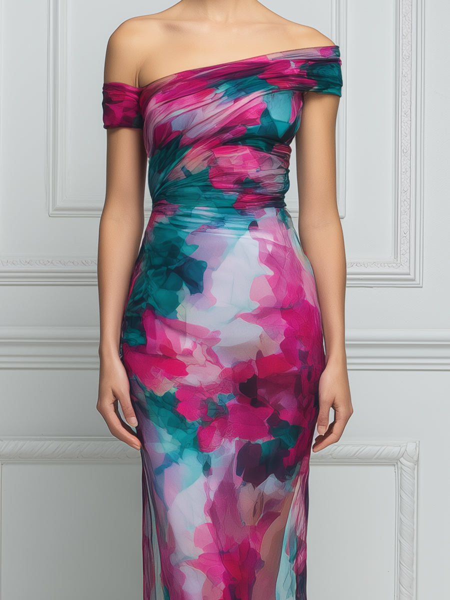Asymmetric Off-Shoulder Ruched Watercolor Print Bodycon Maxi Dress