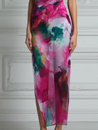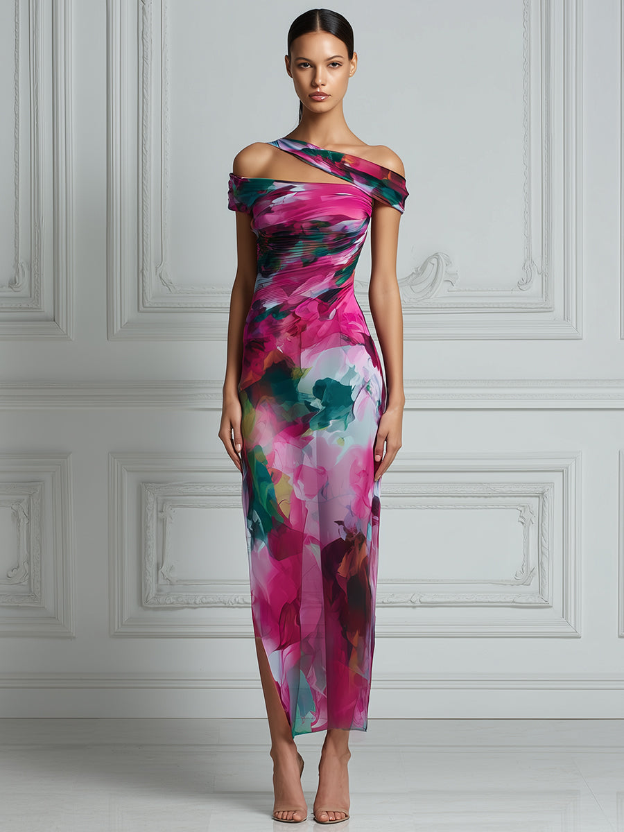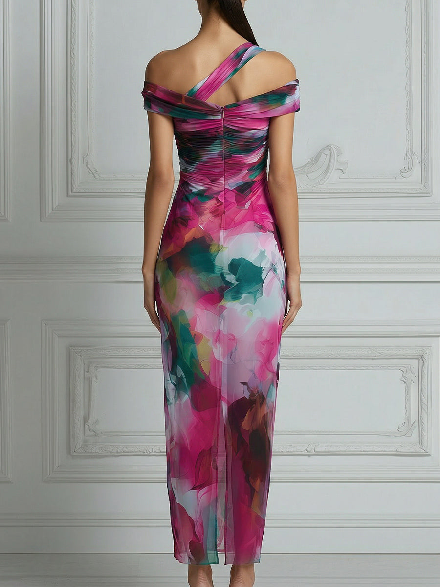Asymmetric Off-Shoulder Watercolor Print Bodycon Midi Dress