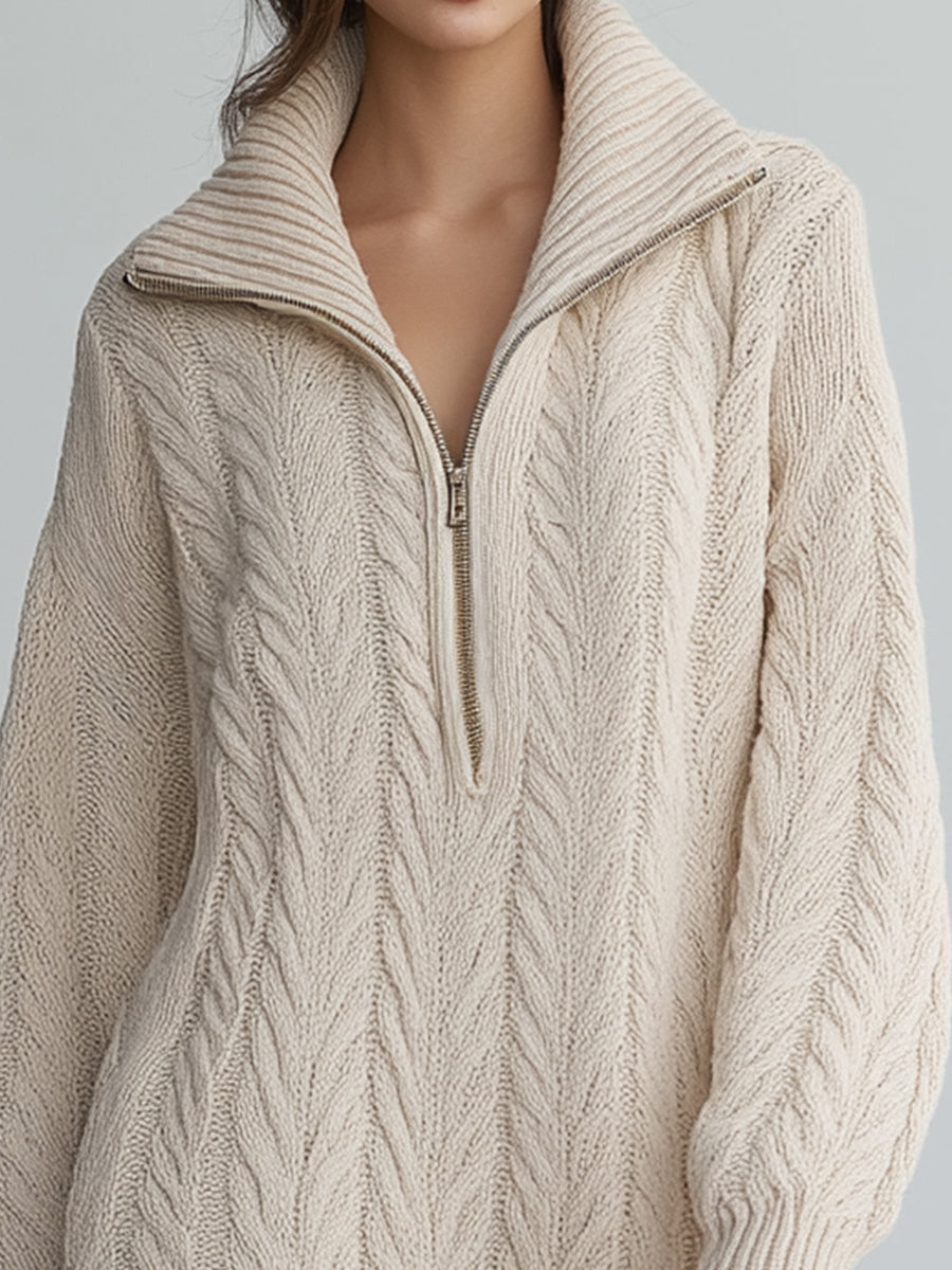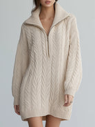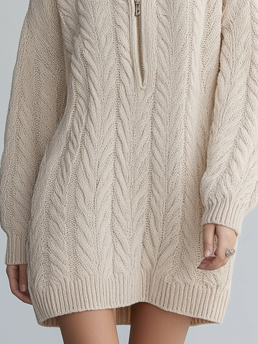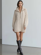 Crovaya presents the Beige Cable-Knit Half-Zip Sweater Dress — a statement of cozy sophistication, crafted for modern women who embrace comfort without compromising style. This dress features a soft, textured cable-knit pattern that evokes timeless charm, reimagined with a contemporary twist through a half-zip neckline and a structured ribbed collar. The relaxed silhouette drapes naturally, offering ease and elegance in every movement.
