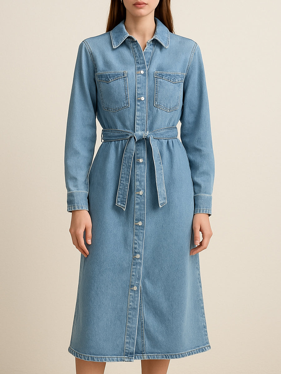The Belted Button-Down Denim Midi Dress combines timeless tailoring with contemporary ease. Designed in a soft light-wash denim, it features a structured shirt collar, front button closure, and two chest pockets for a classic yet elevated look. The detachable self-tie belt cinches the waist, creating a flattering silhouette that enhances the natural curves.