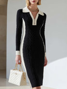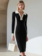 Black And White Contrast Cable Knit Zip-Collar Midi Dress
