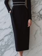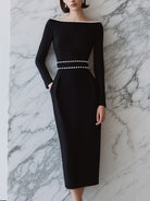 Exuding refined minimalism, the black pearl-trim midi dress is a quintessential Crovaya creation. With a sleek long-sleeve silhouette, this dress is enhanced by pearl detailing along the neckline and waist, blending timeless elegance with modern precision.