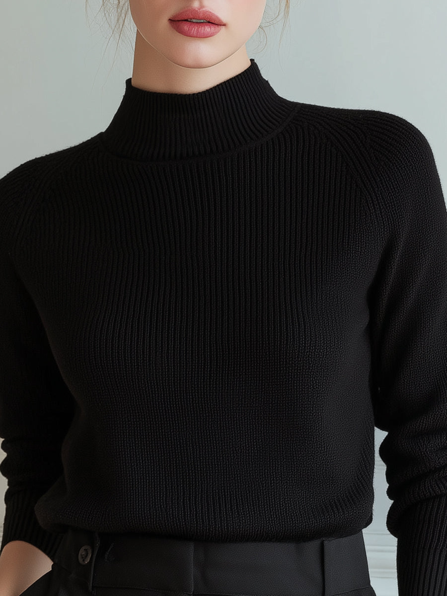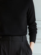 Embrace comfort and elegance with this classic black ribbed turtleneck sweater. Made from a soft, stretchable fabric, this sweater is designed to hug your body, offering both warmth and a flattering fit. The ribbed texture adds dimension and depth, enhancing its timeless design. The high turtleneck and long sleeves make this sweater the perfect layering piece for colder seasons, while its versatile black hue ensures it can be paired with a wide range of bottoms, from skirts to tailored pants.