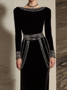 Crovaya introduces a gown that embodies regal sophistication, merging the depth of black velvet with luminous pearl embellishments. This floor-length design highlights the power of detail—pearls tracing the neckline, cuffs, and waistline with graceful precision. The gown is cut to elongate the figure, with tailored long sleeves that balance the fluid drape of the skirt, creating a harmonious silhouette that speaks of timeless refinement. A pearl-draped waist detail adds movement and a touch of couture artistry, framing the body with sculptural elegance.