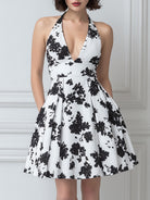 Black & White Floral Print Halter Neck A-Line Mini Dress