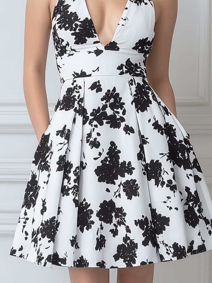Embrace timeless elegance with this sophisticated halter neck mini dress, designed for the modern woman who loves classic prints and flattering silhouettes. Crafted from premium, smooth woven fabric, this piece features a bold black floral print on a crisp white base, creating a striking contrast that exudes understated glamour. The deep V-neck halter bodice cinches at the natural waist, while the flared A-line skirt with built-in pockets adds playful functionality and a feminine, retro-inspired flair. Whether for a chic brunch, a romantic date night, a cocktail party, or a vacation getaway, this dress promises effortless style and refined grace.