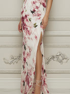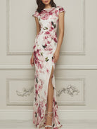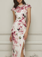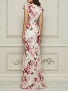 Embrace timeless elegance with this stunning floral gown, crafted for the modern woman who appreciates classic charm and refined sophistication. Made from premium, lightweight chiffon, this dress showcases a breathtaking impressionist watercolor floral print that blooms beautifully against the ivory base, adding a touch of romantic luxury to your formal look. The fitted sheath silhouette accentuates your curves, while the elegant cap sleeves provide subtle coverage and a polished finish. Perfect for garden weddings, evening galas, cocktail parties, or any special formal occasion, this gown delivers effortless grace and unforgettable style.