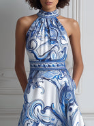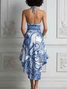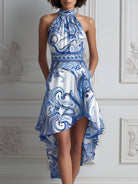 Elevate your wardrobe with this show-stopping halter neck dress, designed for the modern woman who loves bold, artistic prints and feminine silhouettes. Crafted from premium, smooth woven fabric, this piece features a striking blue-and-white baroque-inspired scroll print that exudes timeless luxury and Mediterranean charm. The asymmetrical high-low hem adds dynamic movement, while the gathered halter neckline and cinched waist create a flattering, figure-hugging silhouette. Perfect for tropical vacations, beach weddings, brunch dates, or stylish evening outings, this dress delivers effortless elegance and head-turning style.