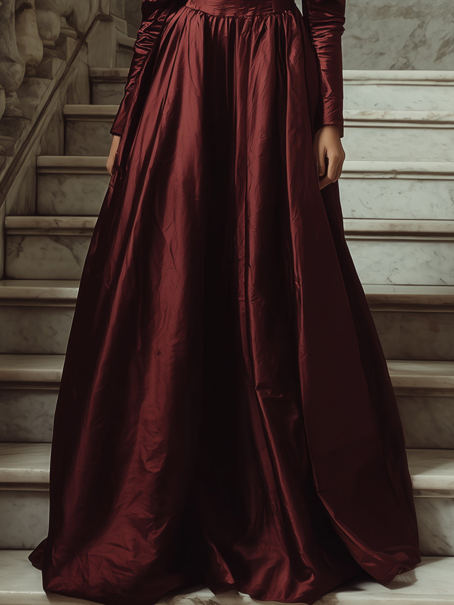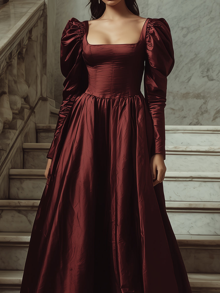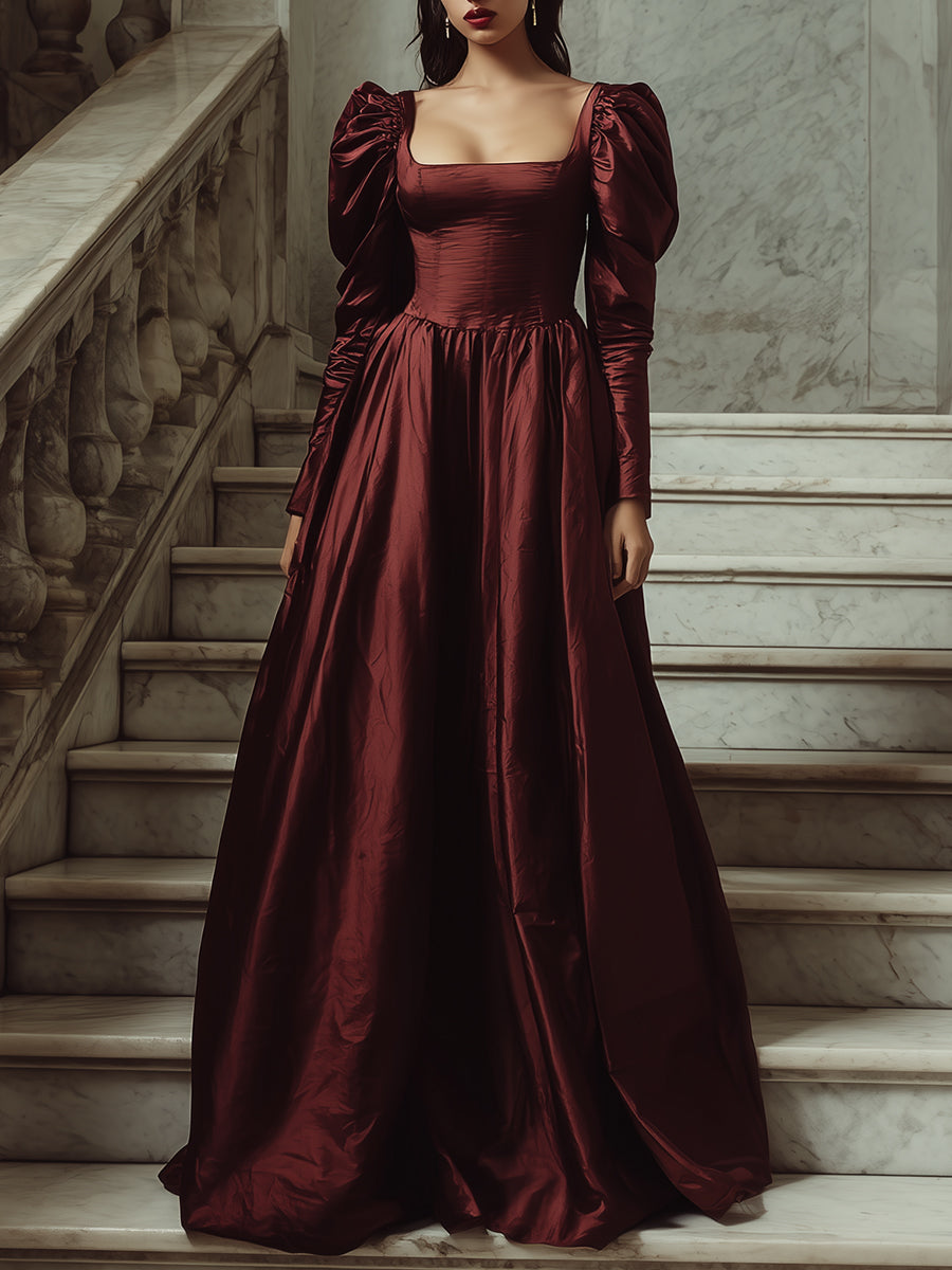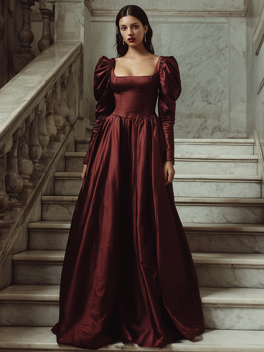 Crovaya presents a statement-making evening gown designed to embody timeless elegance with a dramatic edge. Crafted in luxurious burgundy satin, this gown features a square neckline that perfectly balances femininity and structure. The voluminous puff sleeves add a touch of regal grandeur, while the long fitted bodice flows seamlessly into a full-length A-line skirt, creating graceful movement with every step.