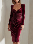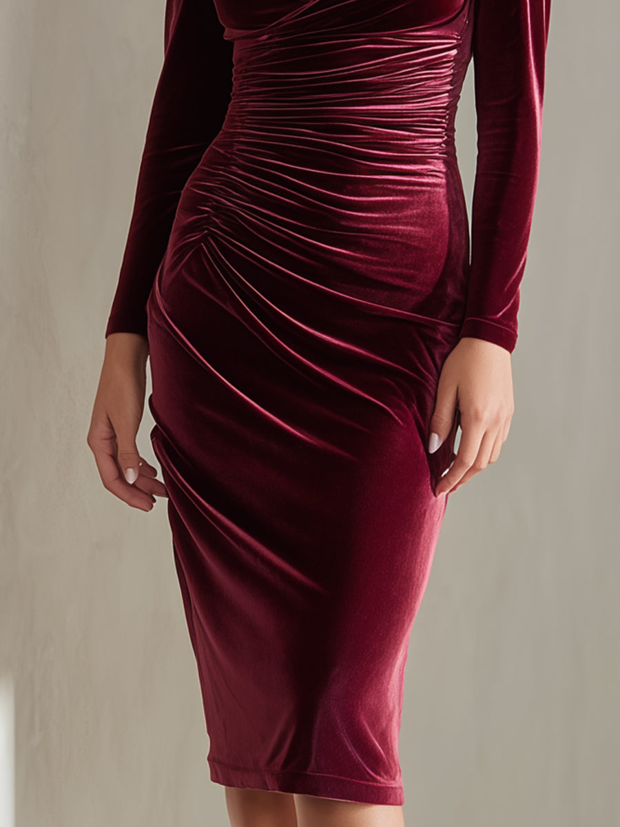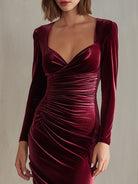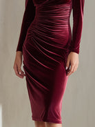 Embrace luxury with the Velvet Draped Midi Dress. This dress exudes sophisticated charm with its deep, rich burgundy hue and stunning velvet fabric. The meticulously draped detailing across the bodice creates a flattering, figure-hugging silhouette, while the long sleeves provide an elegant balance to the open neckline. The fabric's soft texture catches the light beautifully, making it perfect for evening events. Whether you're attending a cocktail party or a chic dinner, this dress is sure to make a statement.