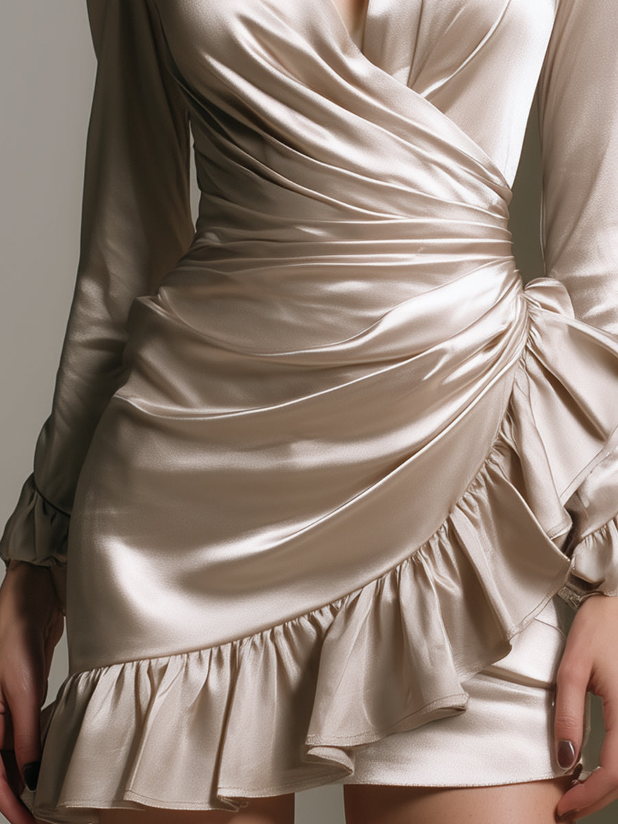 Champagne Long-Sleeve Satin Wrap Ruffle Mini Dress