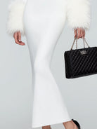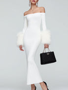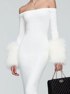 The sleek, body-contouring silhouette gracefully elongates the figure, while the off-shoulder neckline highlights the collarbone and shoulders with understated sensuality. Plush faux fur cuffs at the wrists create a striking contrast, adding texture, glamour, and a winter-inspired refinement to the minimalist design. Every detail is carefully considered to ensure both comfort and structure, with subtle stretch tailoring that molds seamlessly to the body.