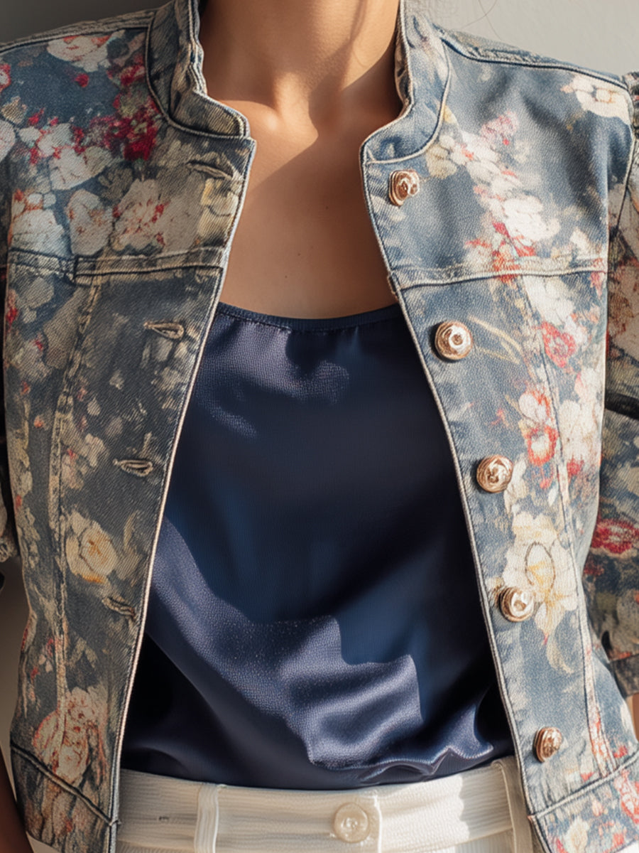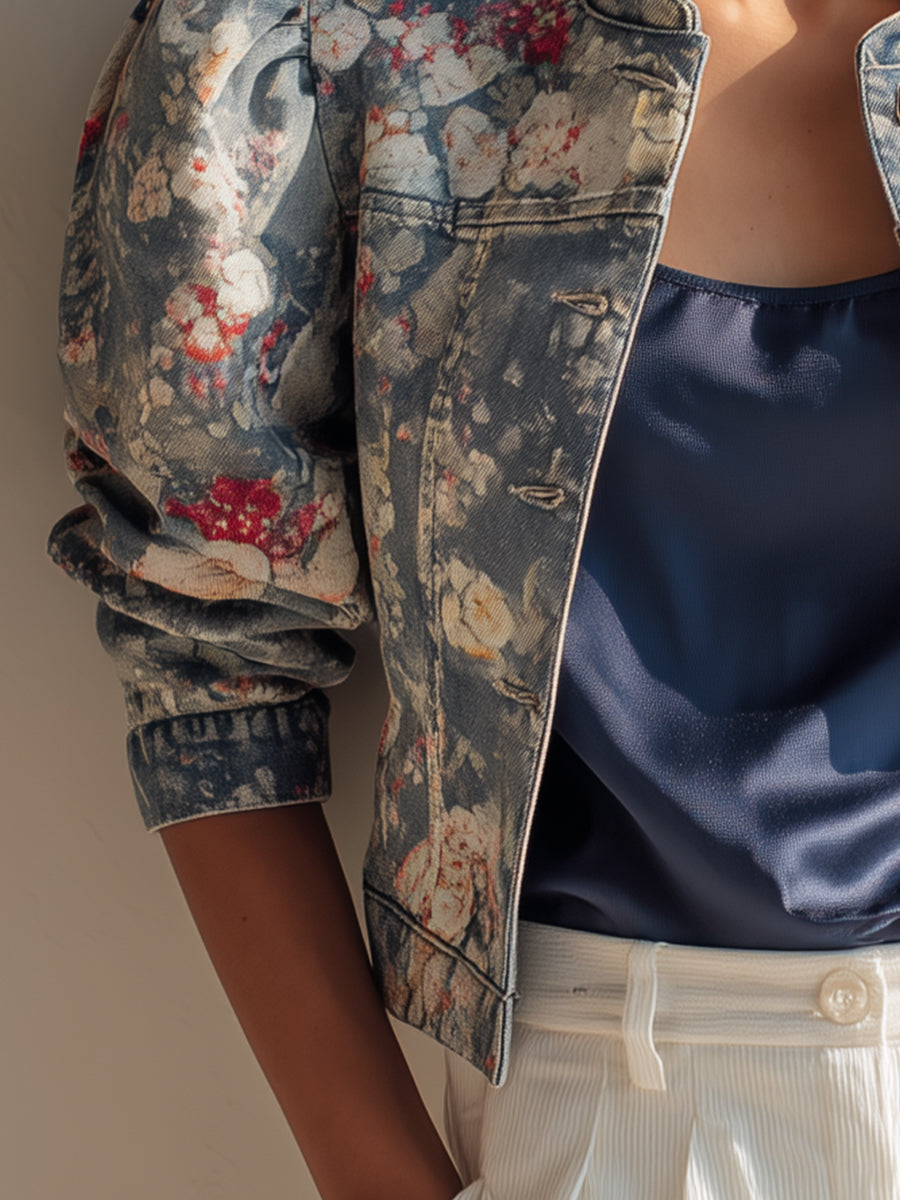 This floral puff-sleeve denim jacket fuses romance with structure for a statement-making outerwear piece. The jacket features a beautiful printed floral pattern on classic blue denim, creating a vintage yet contemporary aesthetic. The puff sleeves add volume and a feminine silhouette, while the cropped cut maintains a modern, flattering proportion.