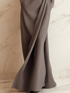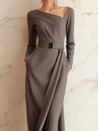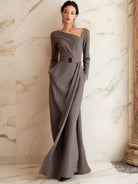 A masterpiece of architectural tailoring, this taupe asymmetric belted gown embodies Crovaya’s devotion to refined luxury. With a one-shoulder neckline and sleek long sleeves, the gown plays with asymmetry while maintaining balance and grace.