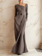 The fitted bodice flows into a fluid skirt that skims the floor, secured by a tonal belt that enhances waist definition. The rich texture adds depth, while its neutral palette allows for versatile styling across evening occasions. Pair with metallic heels and statement earrings for a polished, contemporary look.