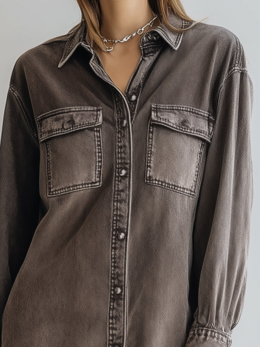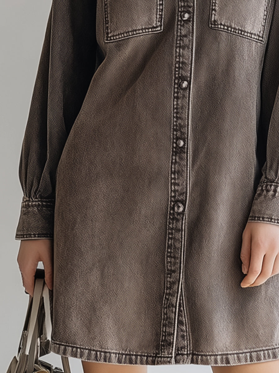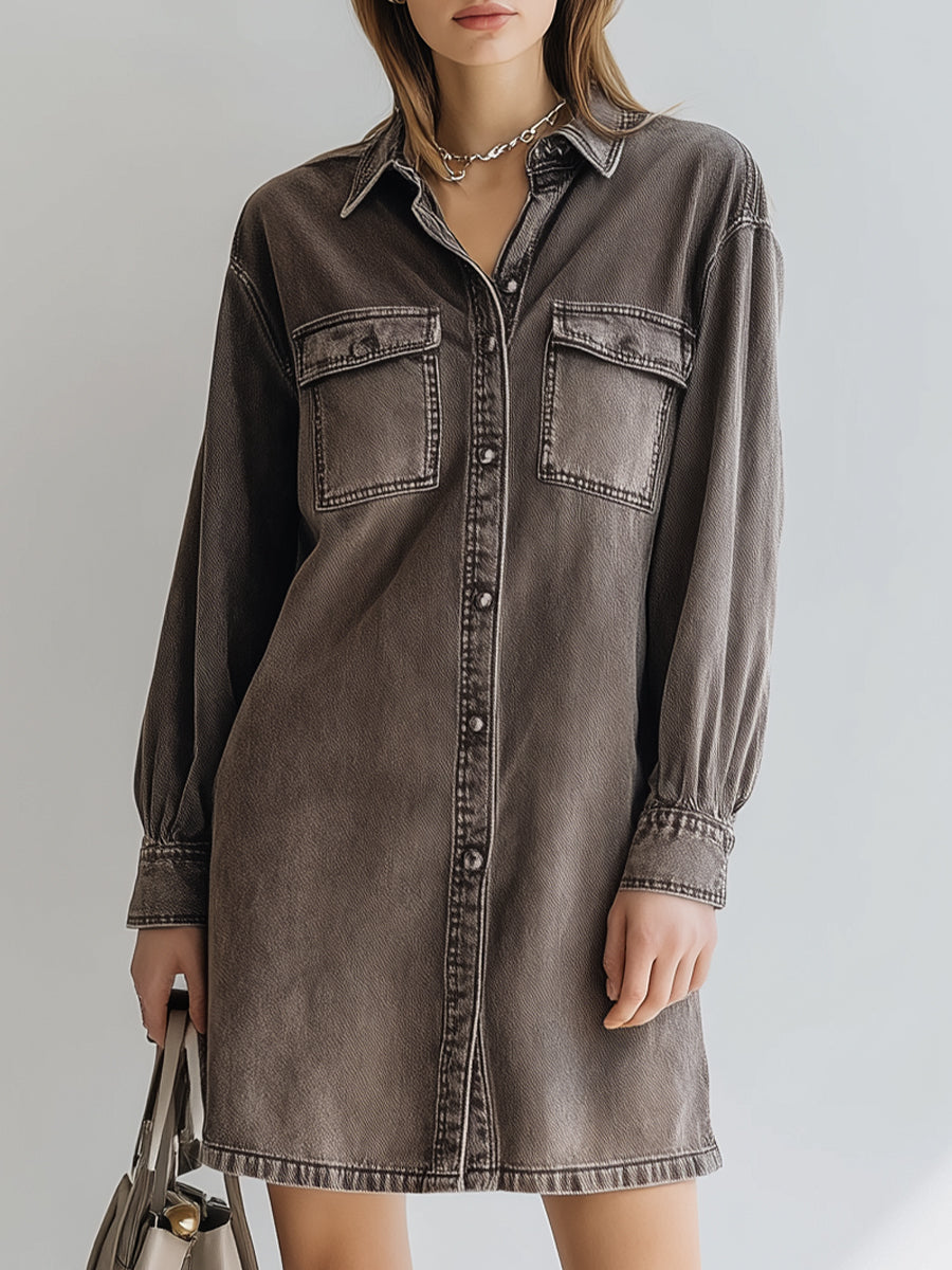 This washed charcoal denim shirt dress captures effortless modern minimalism with a refined edge. Crafted from soft, enzyme-washed denim, it features a relaxed silhouette that drapes beautifully while maintaining a structured profile. The button-down front, flap chest pockets, and pointed collar pay homage to traditional denim craftsmanship, while the faded charcoal tone introduces a sophisticated, urban character. The long sleeves with button cuffs add versatility, making it easy to wear rolled up or full-length for transitional seasons.